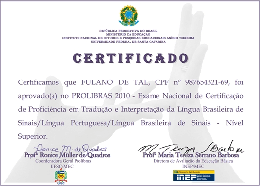 Como cita o Art. 20. do Decreto 5.626, de 22 de Dezembro de 2005: "Nos próximos dez anos, a partir da publicação deste Decreto, o Ministério da Educação ou instituições de ensino superior por ele credenciadas para essa finalidade promoverão, anualmente, exame nacional de proficiência em tradução e interpretação de Libras - Língua Portuguesa".